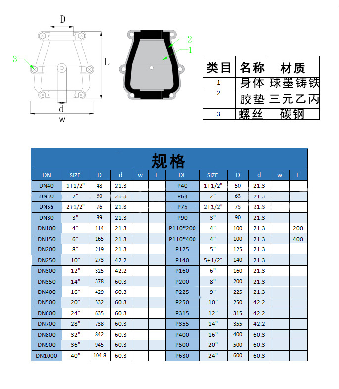 承口补漏器(哈夫节)主要材料:球墨铸铁、天然橡胶。