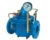 当阀门从进口端给水时,水通过微型过滤器、针型阀、单向阀进入主阀控制室,再经过球阀排水至下游。因为针型阀开度小于球阀开度,即主阀控制室的排水速度大于进水速度,因此控制室压力降低,作用于主阀盘下端的进口压力打开主阀向下游供水。